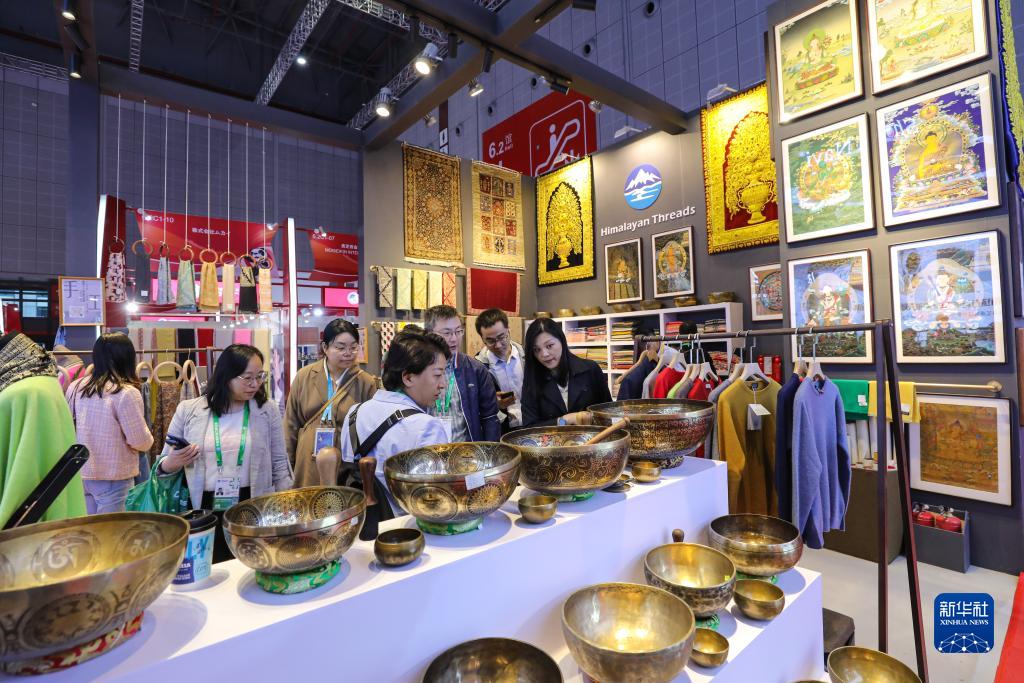 11月7日,在第六屆進博會消費品展區,參觀者在挑選來自尼泊爾的商品。