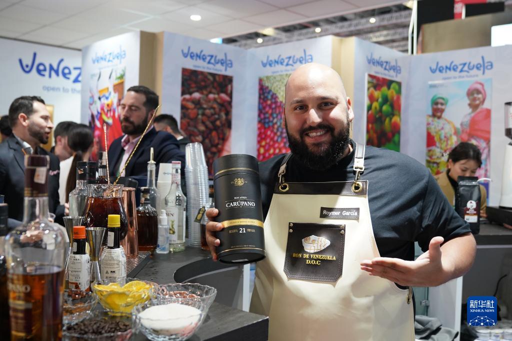 11月7日,展商在第六屆進博會國家展委內瑞拉展臺展示朗姆酒。