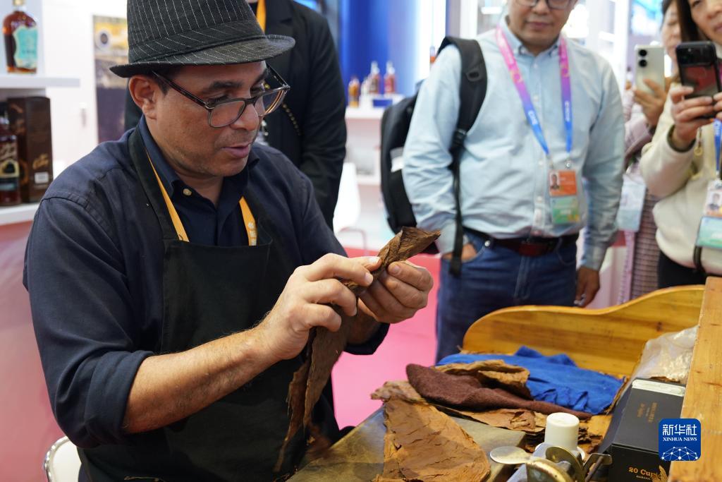 11月7日,展商在第六屆進博會國家展古巴展臺為觀眾演示雪茄制作工藝。