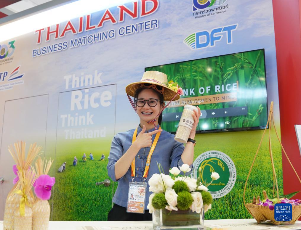 11月7日,展商在第六屆進博會國家展泰國展臺展示泰國香米。
