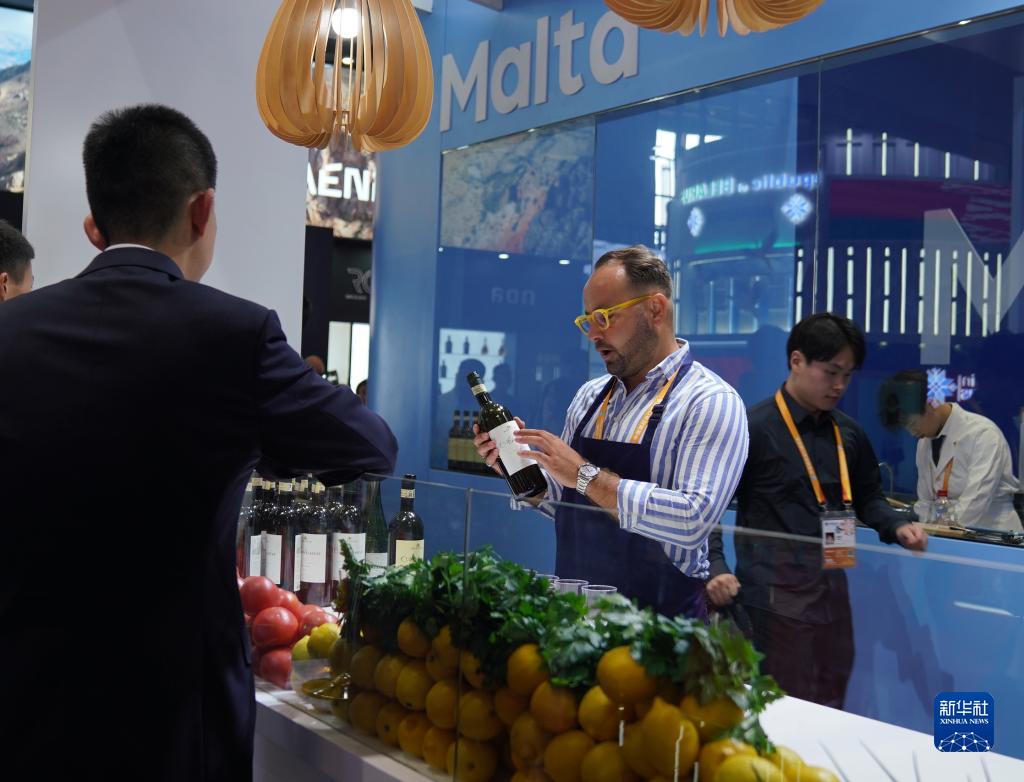 11月5日,展商在第六屆進博會國家展馬耳他展臺介紹馬耳他紅酒。