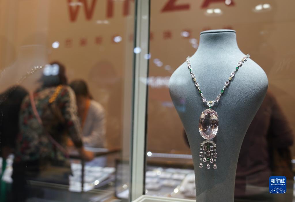 這是11月7日在第六屆進博會消費品展區拍攝的巴基斯坦展商展示的摩根石吊墜項鏈。