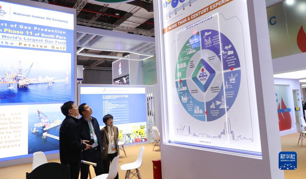 11月7日,參觀者在第六屆進博會技術裝備展區的伊朗石油化學和工業公司展臺邊駐足觀看。