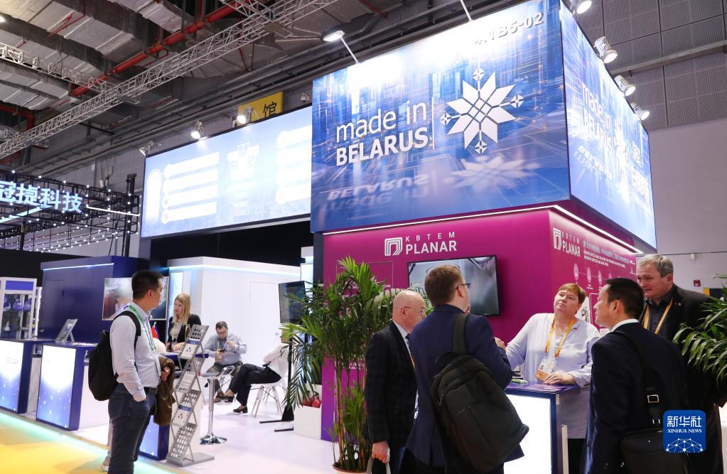 11月7日,參觀者在第六屆進博會技術裝備展區的白俄羅斯企業聯合展臺與展方工作人員交流。