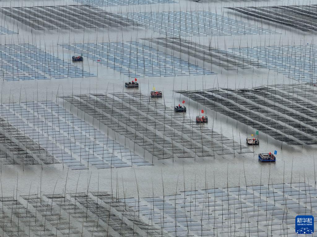 近日,溫州市蒼南縣“頭水紫菜”進入采收期,紫菜養殖戶駕船采收,一派繁忙景象。蒼南縣是浙江著名紫菜產區,有“紫菜之鄉”的美譽。