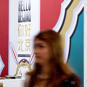 11月6日,一名女子在英國倫敦世界旅游交易會中國展區參觀。