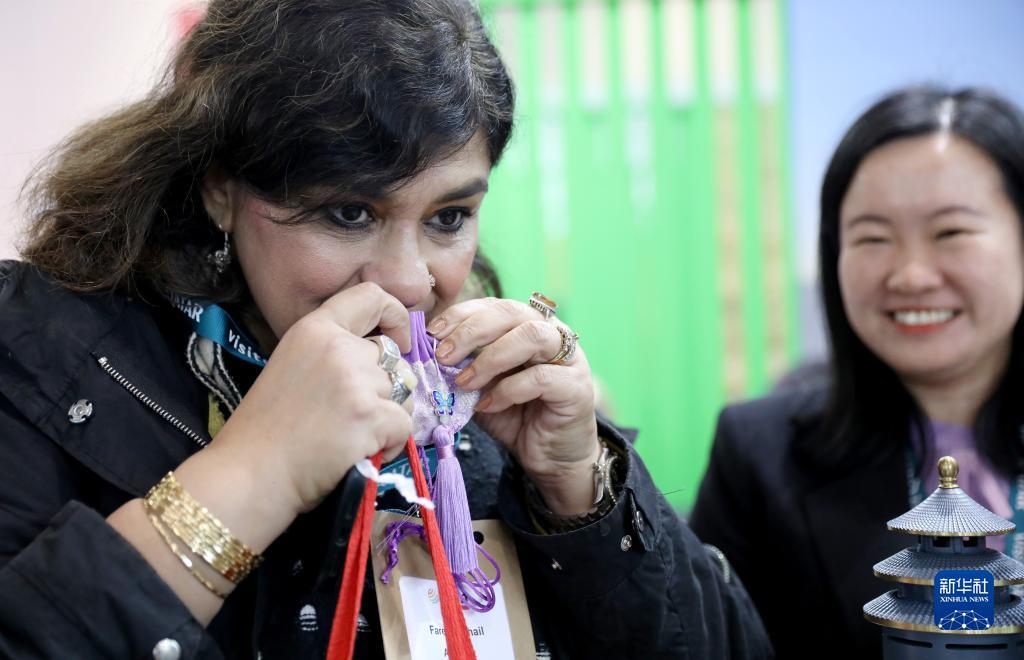 11月6日,在英國倫敦世界旅游交易會中國展區,一名女子嗅聞現場制作的香包。