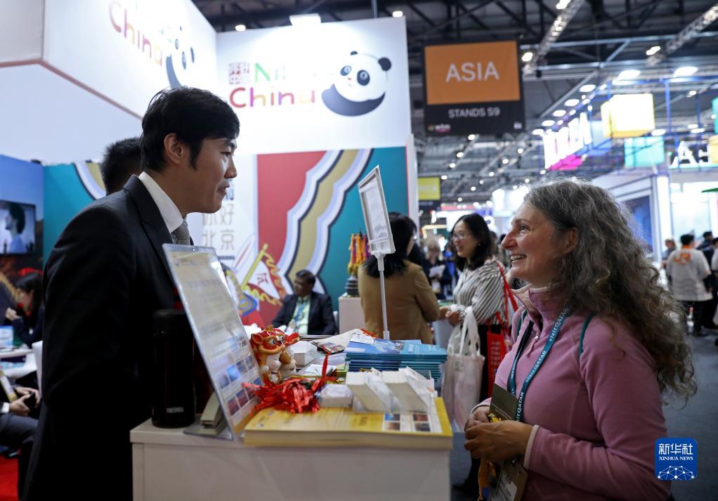 11月6日,一名女子在英國倫敦世界旅游交易會中國展區與工作人員交流。