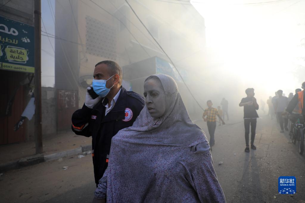 11月7日,在加沙地帶南部城市汗尤尼斯,人們在遭到以色列襲擊的建筑廢墟上實施救援。