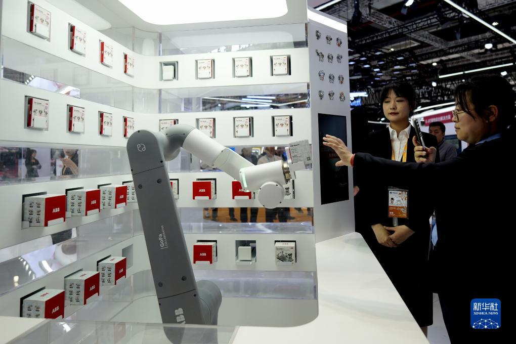 11月7日在第六屆進博會技術裝備展區ABB展臺拍攝的機器人。