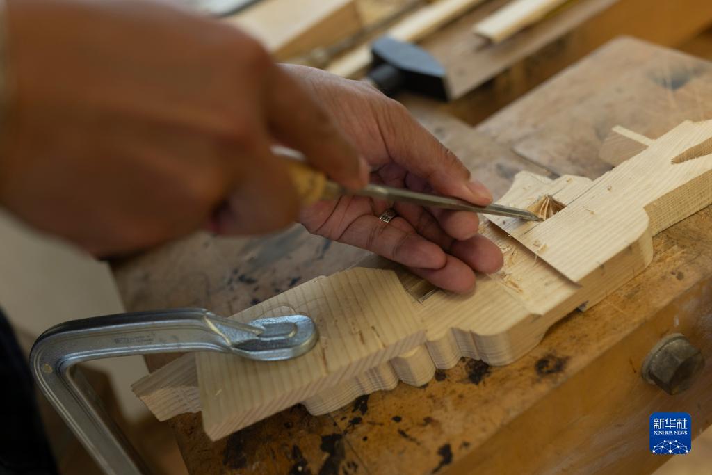 10月10日,在斯洛文尼亞盧布爾雅那的民族志博物館,故宮博物院專家鮑杰制作大門模型缺失的部件。