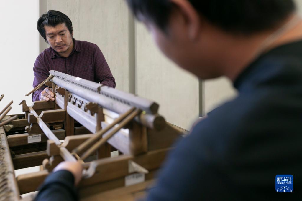 10月16日,在斯洛文尼亞盧布爾雅那的民族志博物館,故宮博物院專家鮑杰(左)和史孫明修復中國古建筑木質大門模型。