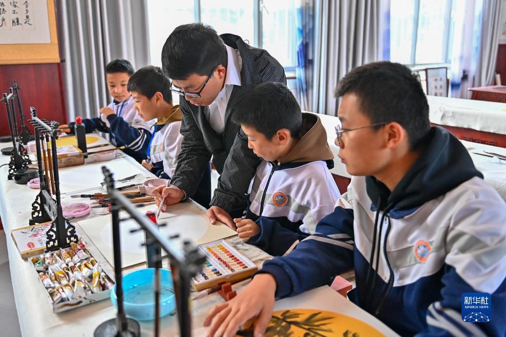 在新疆阿克陶縣雪松中學,“紅杜鵑”國畫社團的學生在老師的指導下練習繪畫(11月7日攝)。