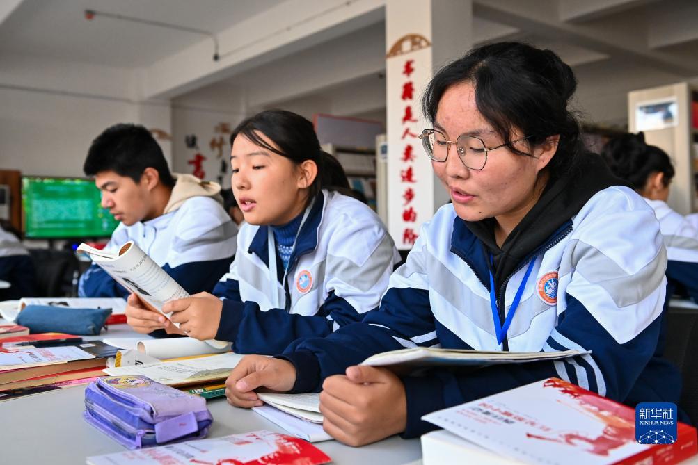 在新疆阿克陶縣雪松中學,“紅杜鵑”誦讀社團的學生在圖書館誦讀紅色經典書籍(11月7日攝)。