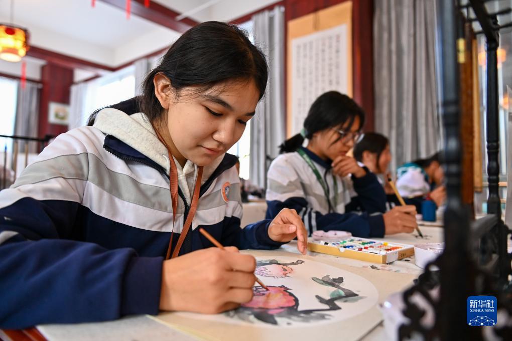 在新疆阿克陶縣雪松中學,“紅杜鵑”國畫社團的學生在練習繪畫(11月7日攝)。