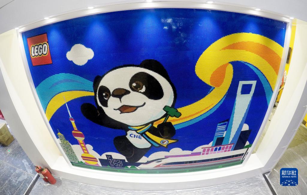 這是2018年10月31日在國家會展中心(上海)拍攝的一面以首屆中國國際進口博覽會吉祥物“進寶”為主題的樂高積木墻。