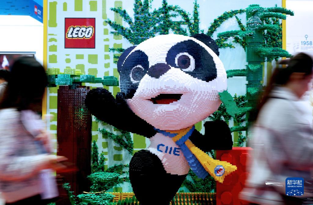 2019年11月9日,在第二屆進博會品質生活展區,觀眾走過樂高集團展出的“3D進寶”。