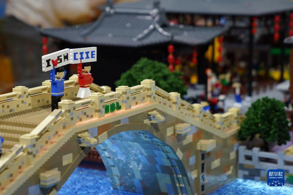 11月7日在第六屆進博會消費品展區樂高集團展臺拍攝的楓涇古鎮樂高模型。