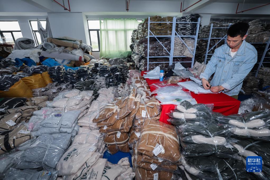 11月8日,在位于織里鎮的湖州慕橙服飾有限公司庫房內,工作人員根據網絡訂單打包童裝。