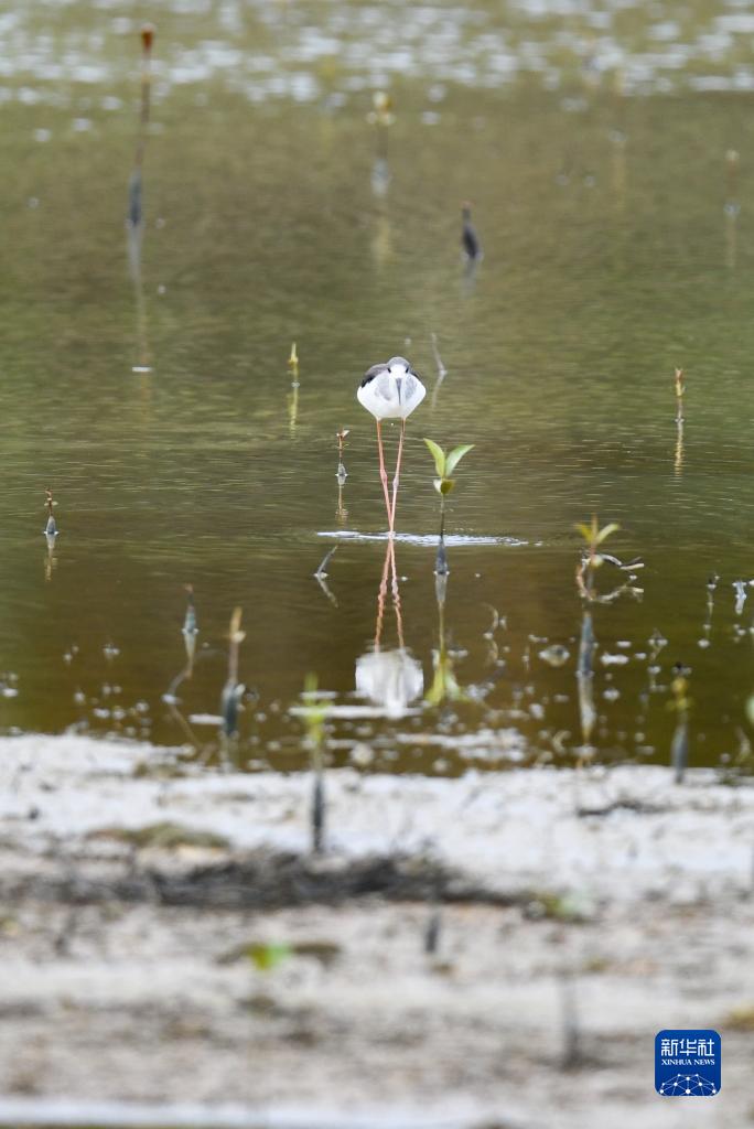 11月8日,一只黑翅長腳鷸在海南東寨港(三江灣)生態修復項目種植的紅樹林間覓食。