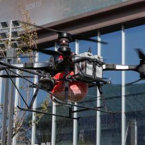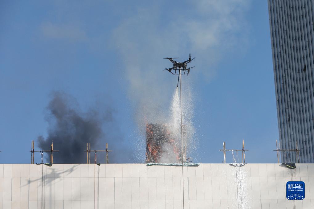 11月8日,高噴滅火無人機進行高層建筑滅火救援實戰演練。