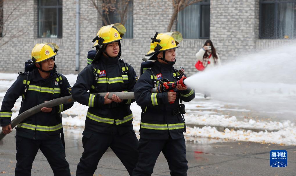 11月8日,在沈陽工學院,消防救援隊員進行演練。