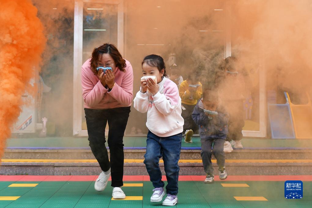 11月8日,在山東省煙臺市福山區清洋街道城西幼兒園,老師引導小朋友進行消防應急疏散演練。