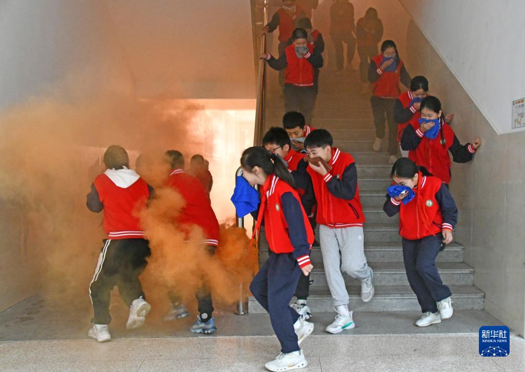 11月8日,浙江省臺州市仙居縣安洲小學學生在進行火災逃生演練。
