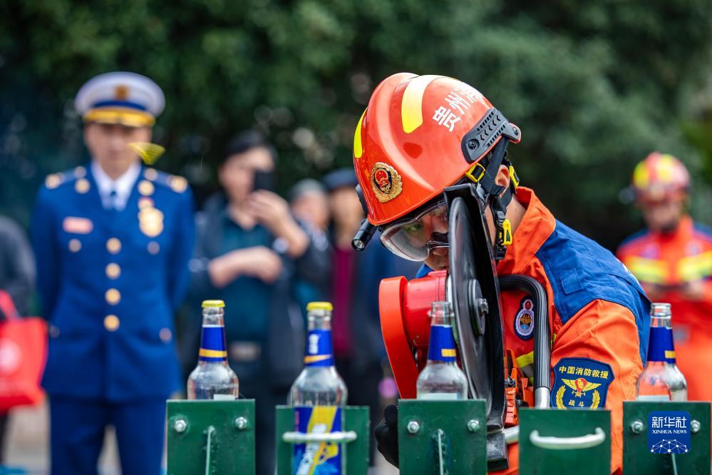 11月8日,在貴州省黔西市水西廣場,消防員演示雙輪異向切割機開瓶蓋。