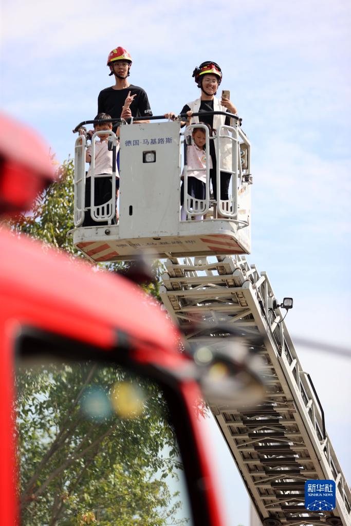 11月8日,在福建省廈門市翔安區消防宣傳月啟動儀式現場,小朋友和家長體驗消防云梯車。