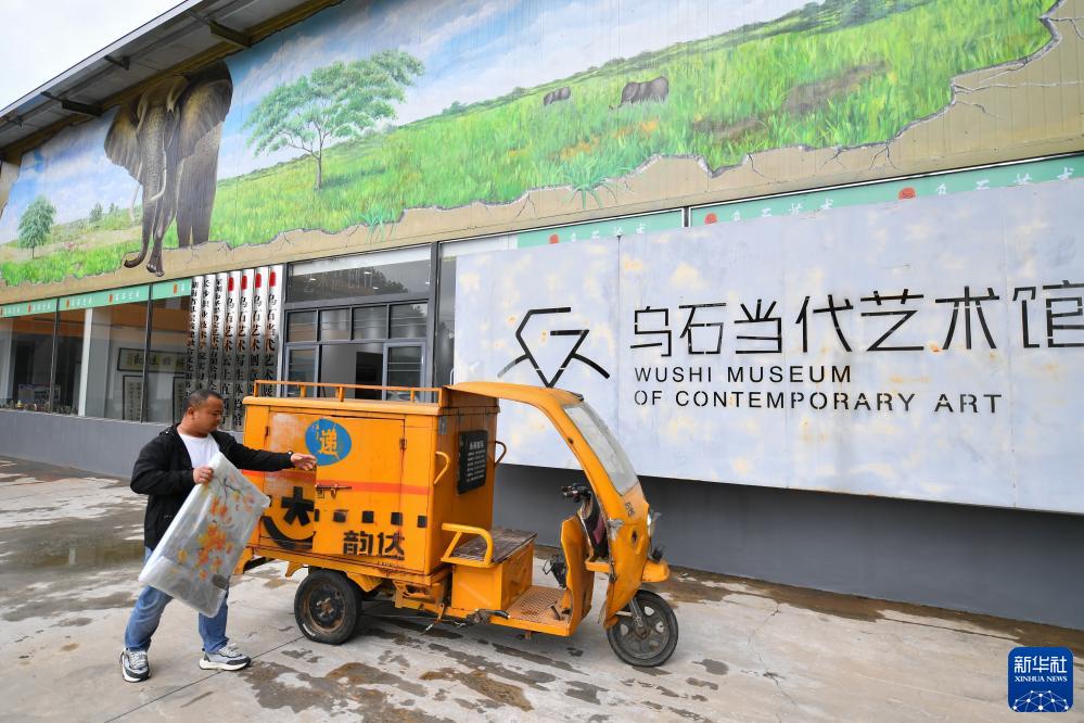 11月8日,在湖南省瀏陽市小河鄉烏石村的烏石當代藝術館,快遞員準備將油畫放置到快遞車上。