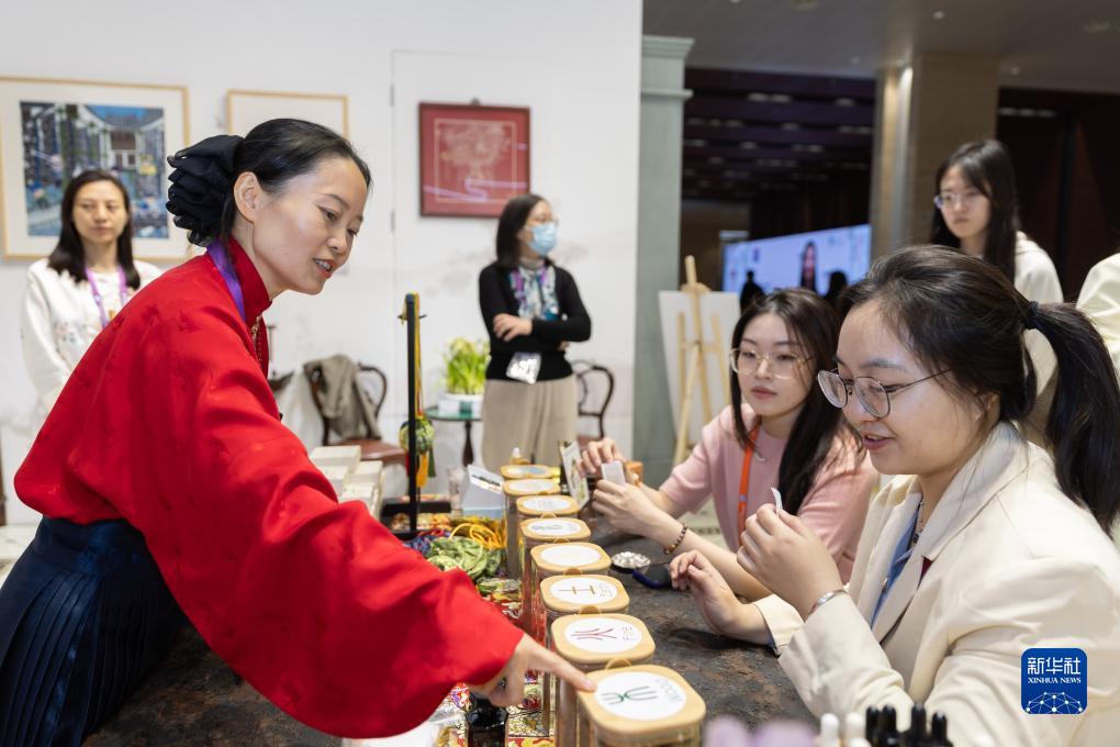 11月8日,在第六屆進博會新聞中心的上海非遺客廳,記者體驗非遺中醫藥香品調制技藝——個人體質香囊制作。