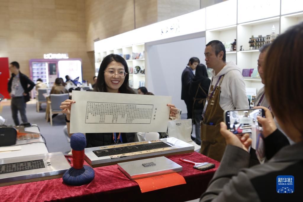 11月8日,在進博會新聞中心,記者在體驗活字拓印。