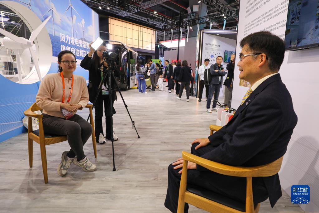 11月7日,新華社記者在第六屆進博會消費品展區采訪松下控股株式會社全球副總裁本間哲朗。
