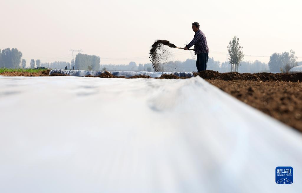 11月8日,農民在河北省石家莊市藁城區常安鎮里莊村覆蓋蔬菜地膜。