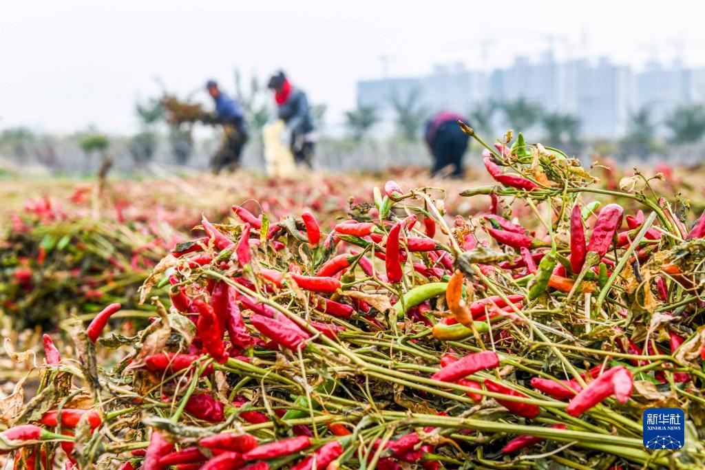 11月8日,農民在河北省遵化市一家蔬菜專業合作社種植基地收獲辣椒。