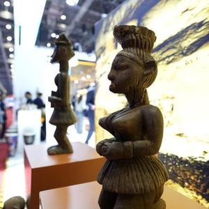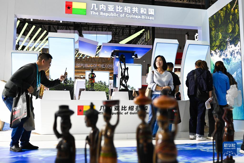 11月8日,觀眾在第六屆進博會幾內亞比紹共和國展臺拍照。