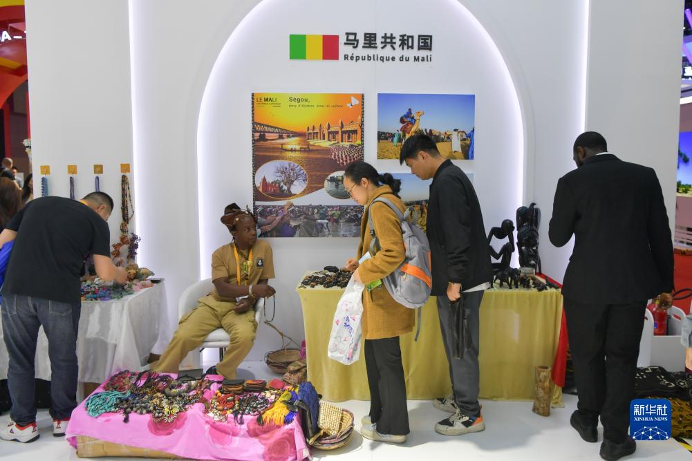 11月8日,觀眾在第六屆進博會國家展馬里共和國館了解傳統手工藝品。