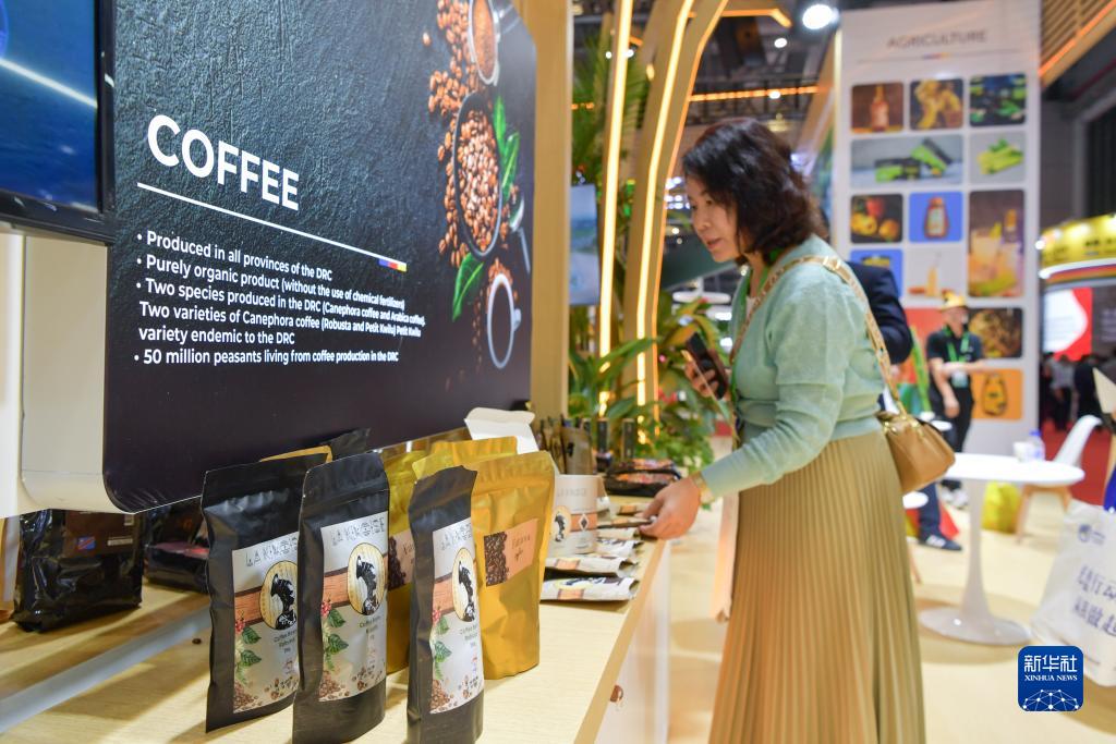 11月8日,在第六屆進博會國家展剛果民主共和國館,觀眾在了解咖啡產品。