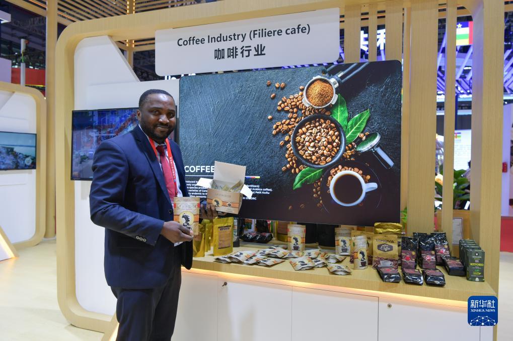 11月8日,在第六屆進博會國家展剛果民主共和國館,展商展示產自金沙薩的咖啡產品。