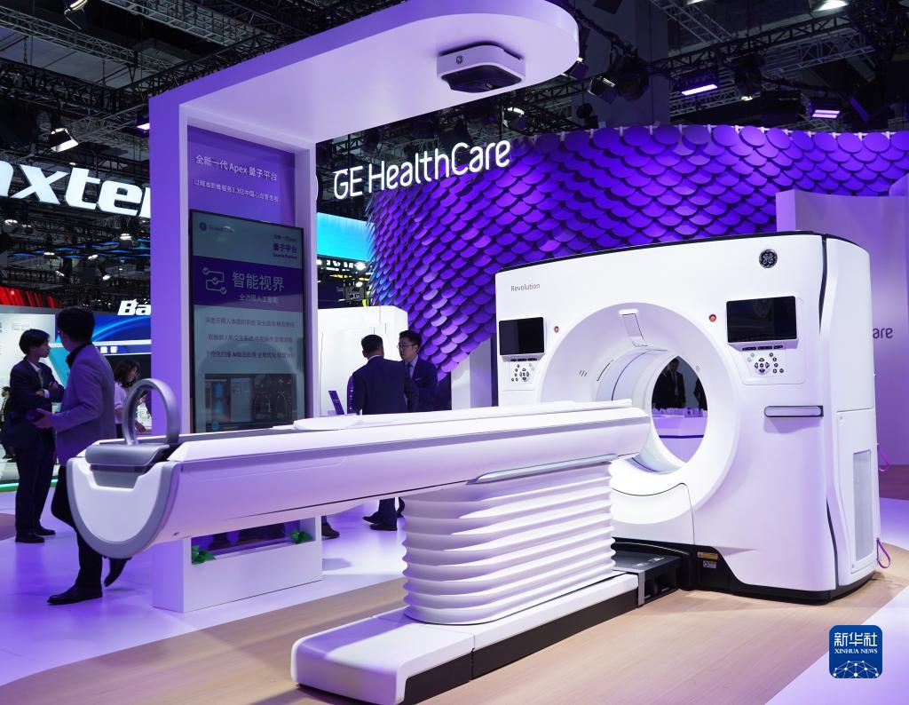 11月6日,在第六屆進博會醫療器械及醫藥保健展區GE醫療展臺拍攝的全新一代Apex量子平臺。