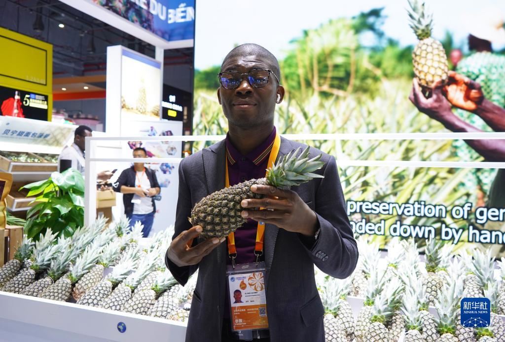 11月8日,在第六屆進博會食品及農產品展區,工作人員展示貝寧菠蘿。這是貝寧菠蘿第一次參加進博會。