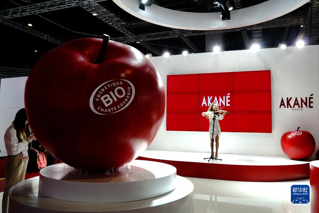 11月7日,在第六屆進博會消費品展區,演員在化妝品AKANE展臺上進行小提琴表演。