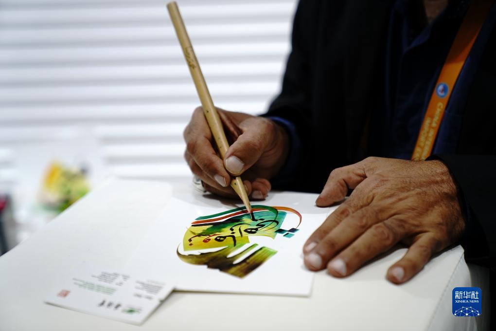 11月7日,在第六屆進博會國家展區,一位巴林王國的藝術家用阿拉伯文為觀眾書寫姓名。