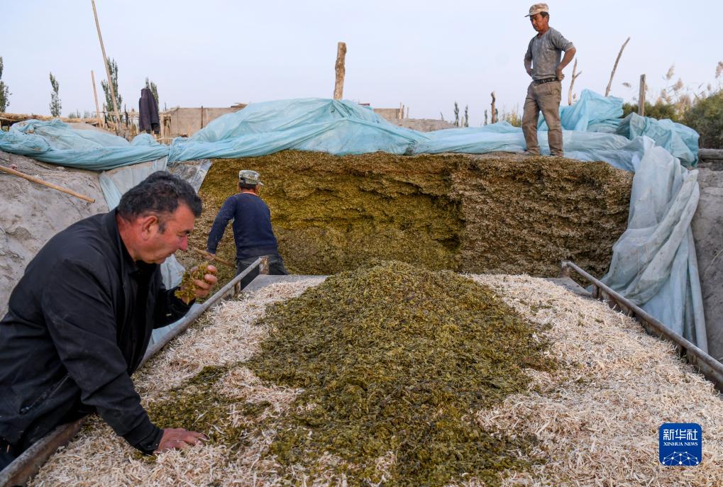 在新疆尉犁縣巴西買里村,爾肯檢查草料是否霉變(10月19日攝)。
