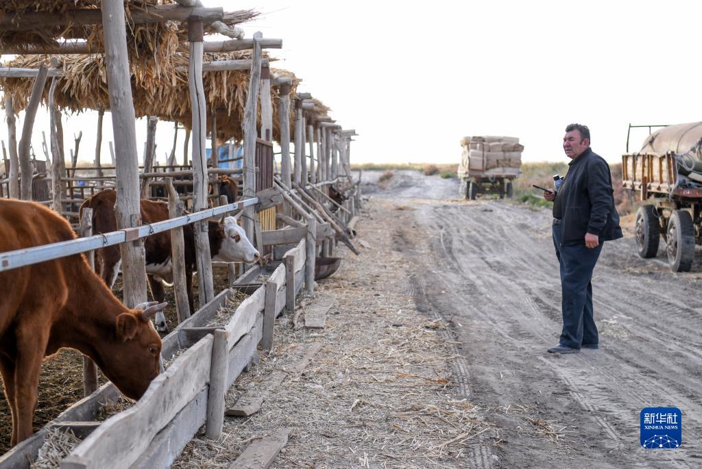在新疆尉犁縣巴西買里村,爾肯查看自家養的牛(10月19日攝)。