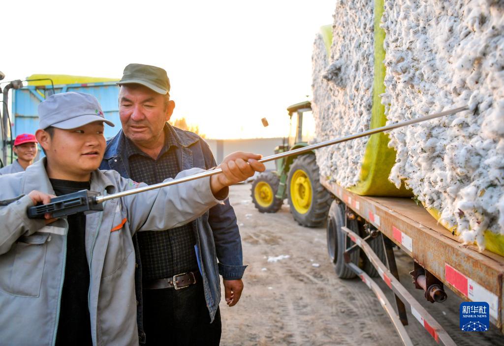 在新疆尉犁縣一家棉花加工廠外,爾肯(右)陪著工作人員檢測自家棉花濕度(11月1日攝)。