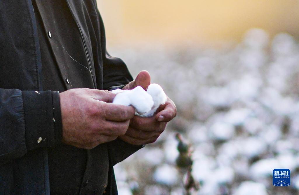 在新疆尉犁縣縣巴西買里村,爾肯在自家的棉田中查看棉花(10月20日攝)。