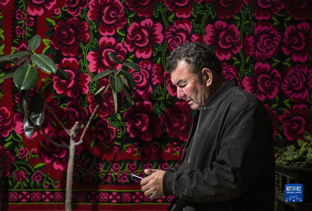 在新疆尉犁縣巴西買里村,爾肯在家里打電話聯系采棉機(10月20日攝)。