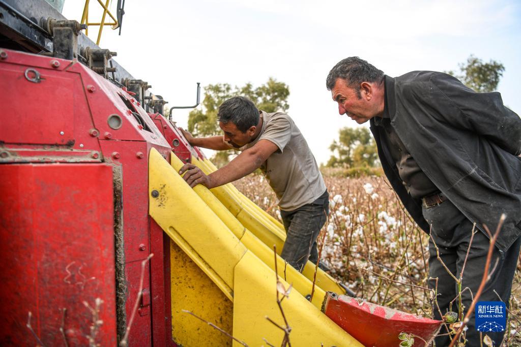 在新疆尉犁縣巴西買里村,爾肯在自家的棉田中查看采棉作業(10月20日攝)。